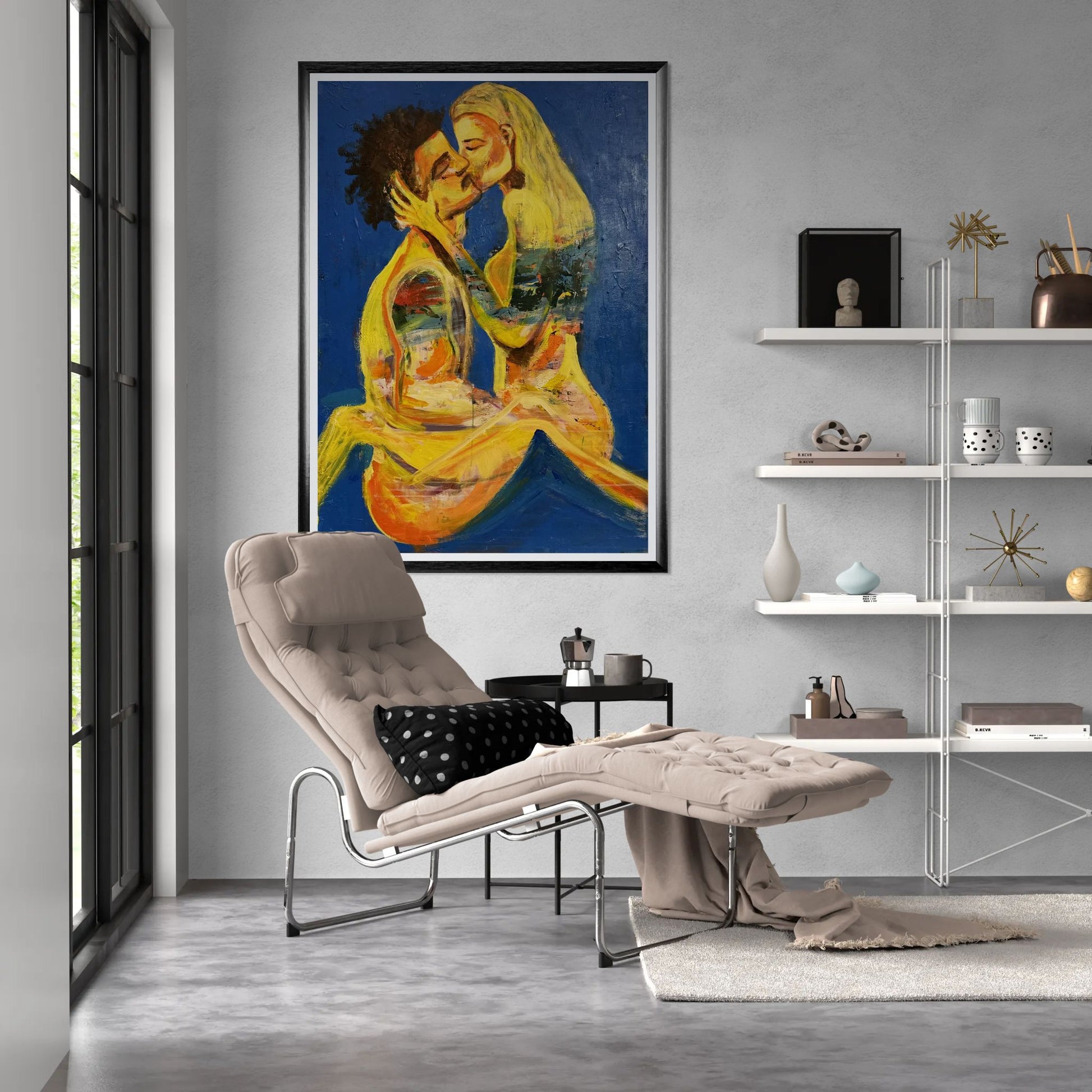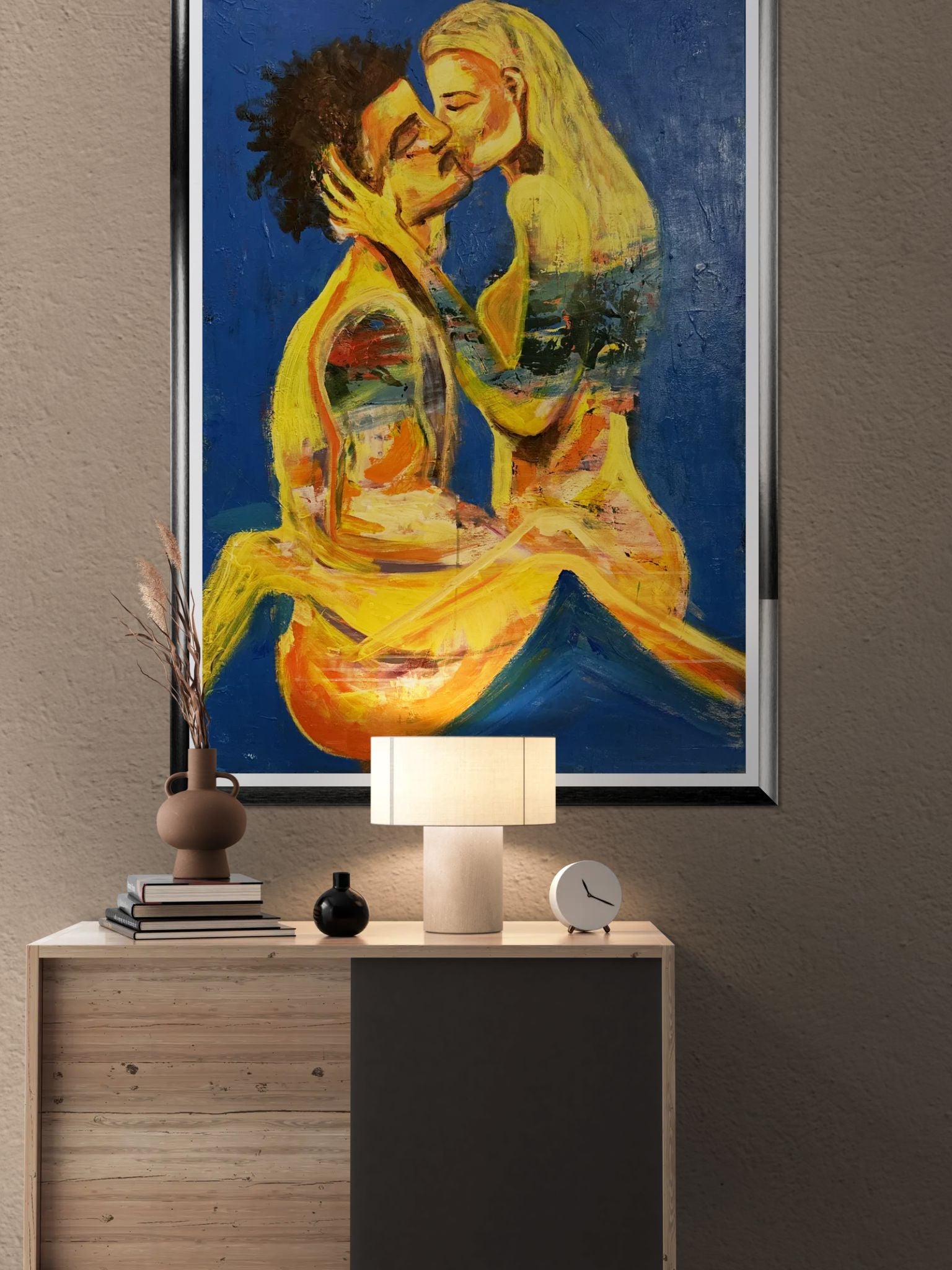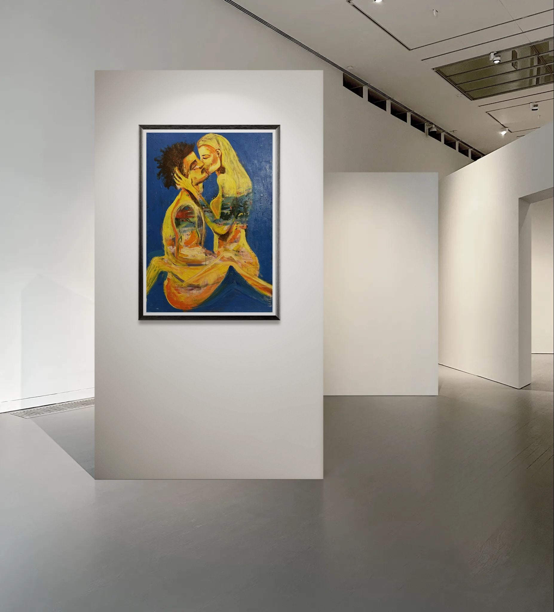 Fusion is a 120 × 80 cm acrylic on canvas, a vivid exploration of unity and contrast. The dominant yellow figure radiates warmth and vitality, set against a deep blue ground that enhances its intensity. The interplay of color and form symbolizes both tension and harmony, drawing the viewer into a dialogue between energy and stillness.