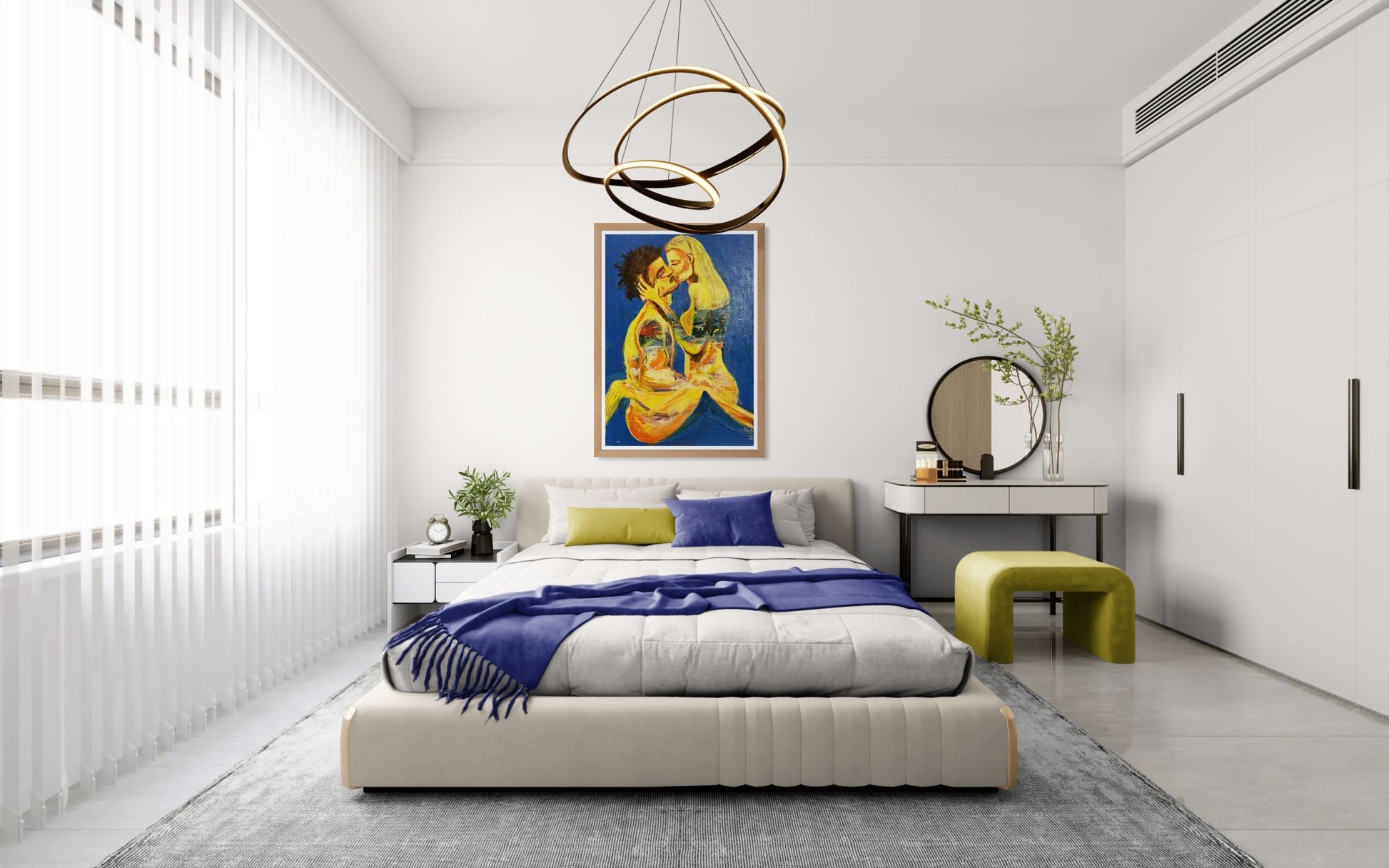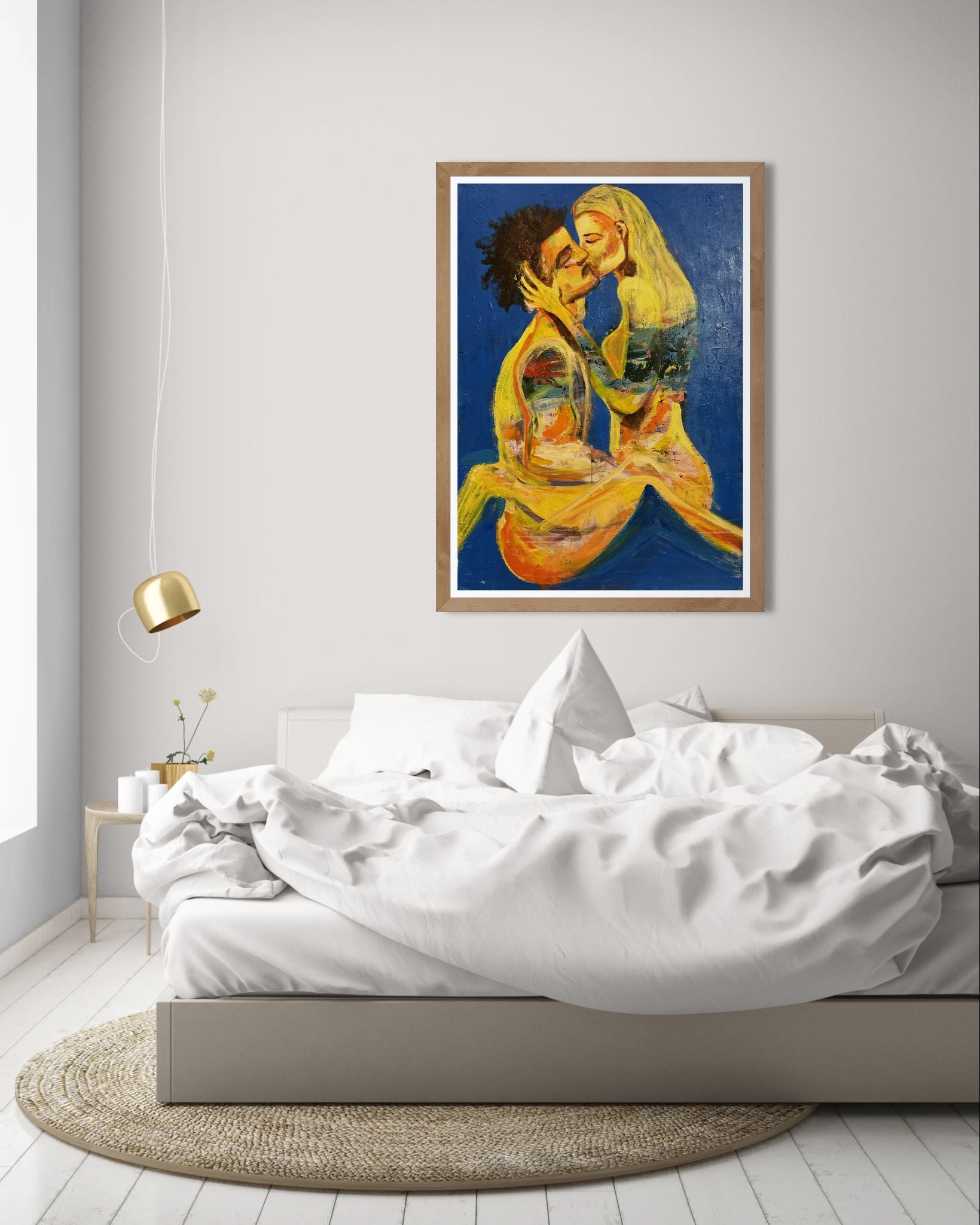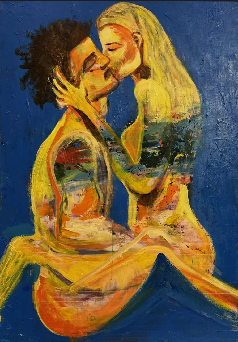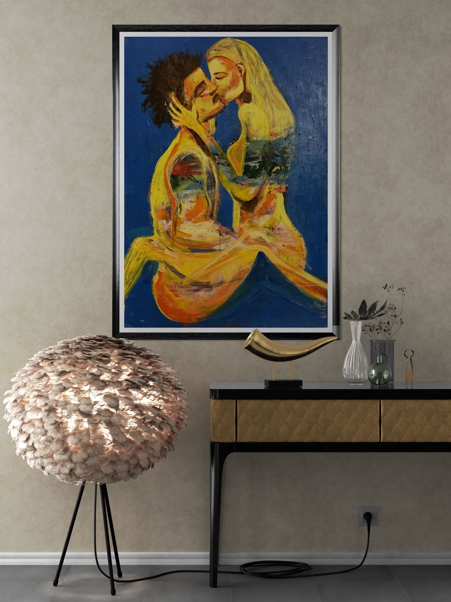 Fusion is a 120 × 80 cm acrylic on canvas, a vivid exploration of unity and contrast. The dominant yellow figure radiates warmth and vitality, set against a deep blue ground that enhances its intensity. The interplay of color and form symbolizes both tension and harmony, drawing the viewer into a dialogue between energy and stillness.