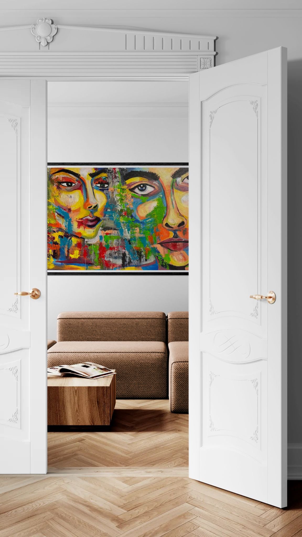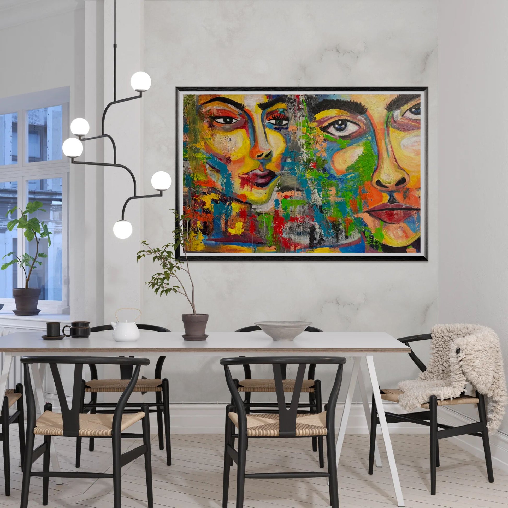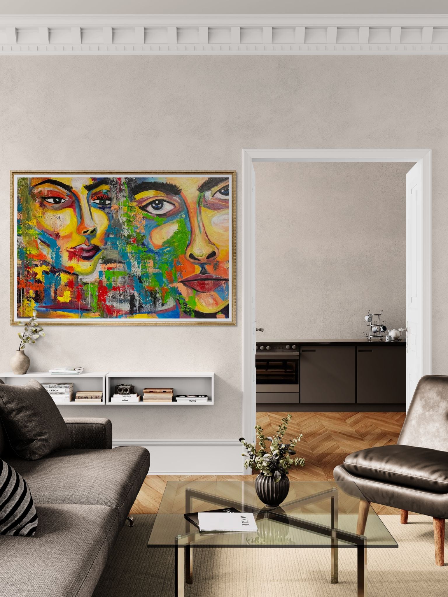 Glitches of Identity is a large-format acrylic on canvas (160 cm width) that explores the tension between authentic selfhood and digital distortion. Faces emerge and fragment across vibrant layers of color, suggesting the fractured ways in which identity is constructed, perceived, and reshaped in the modern age.