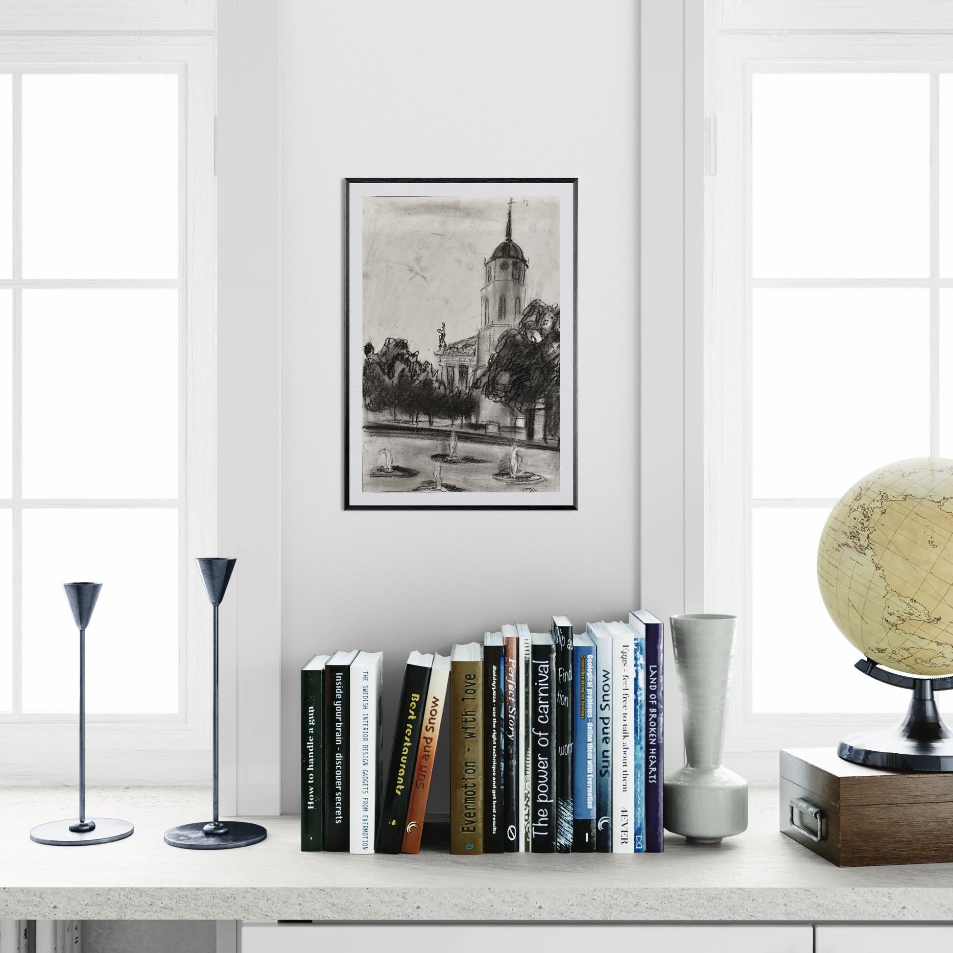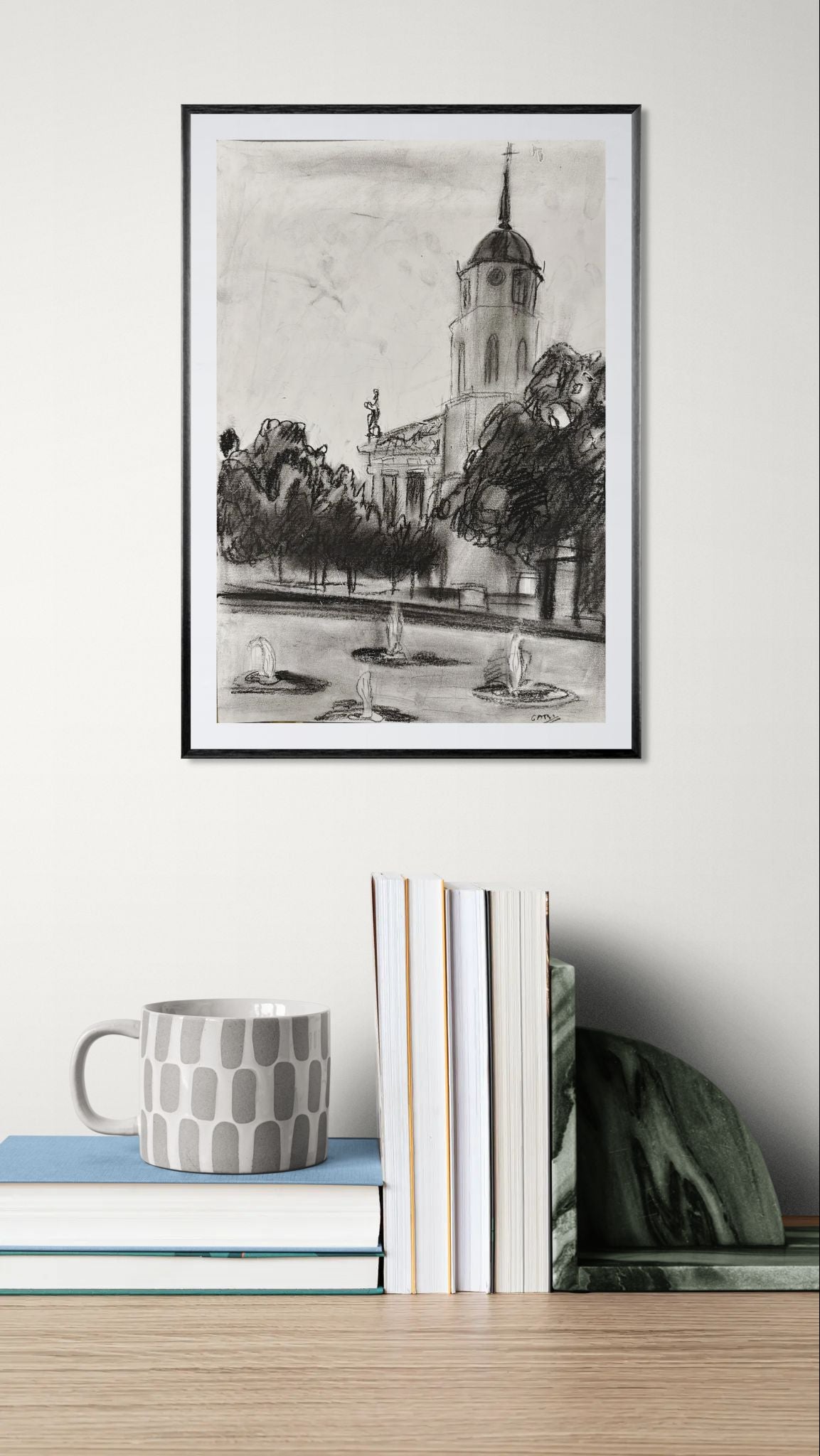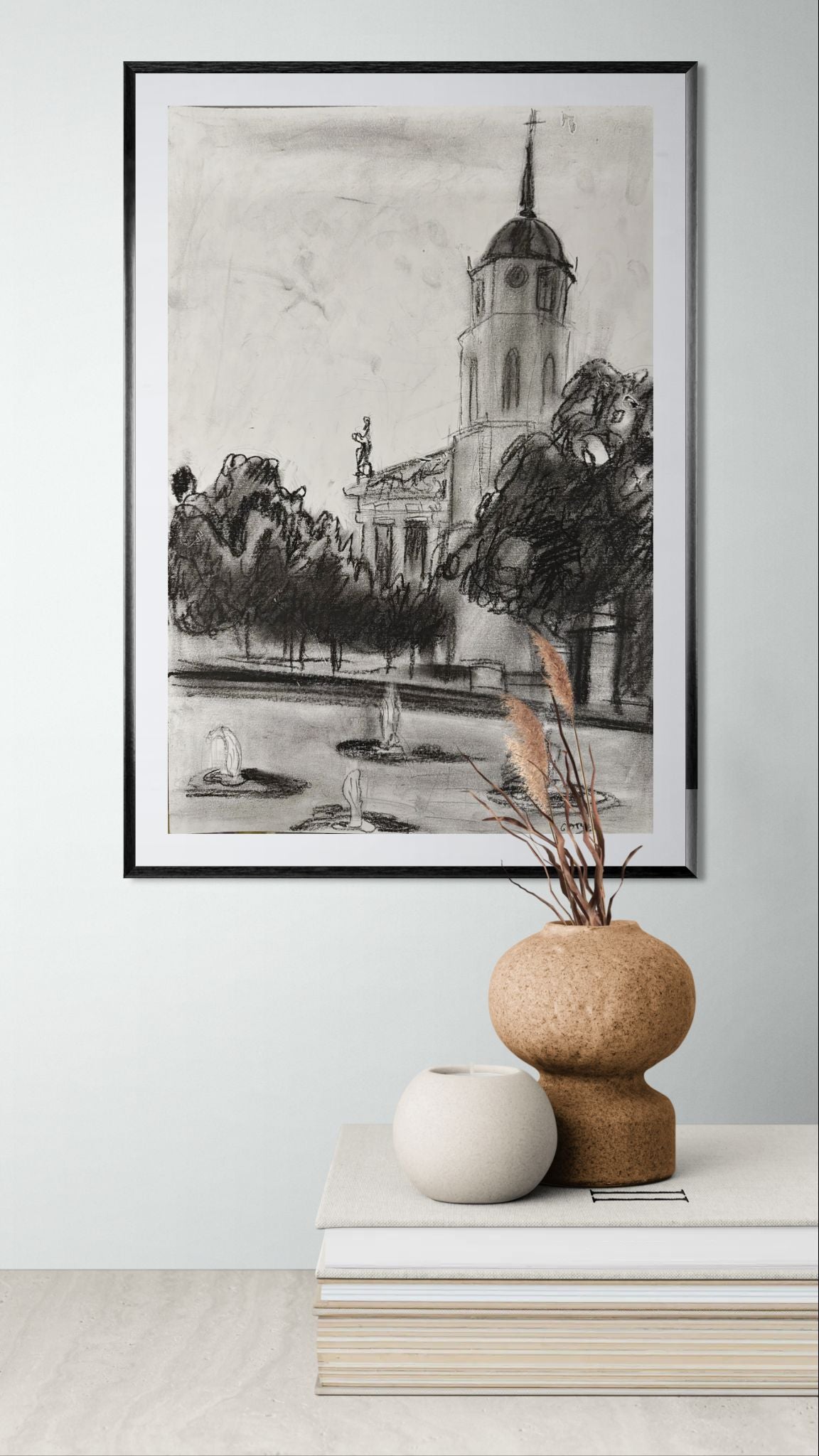 “Gloomy Vilnius Cathedral” captures Lithuania’s most iconic landmark in a haunting, atmospheric light. Drawn in graphite with dramatic contrasts, the piece reflects both the architectural grandeur of the Cathedral and the emotional weight it carries in Vilnius’ history.