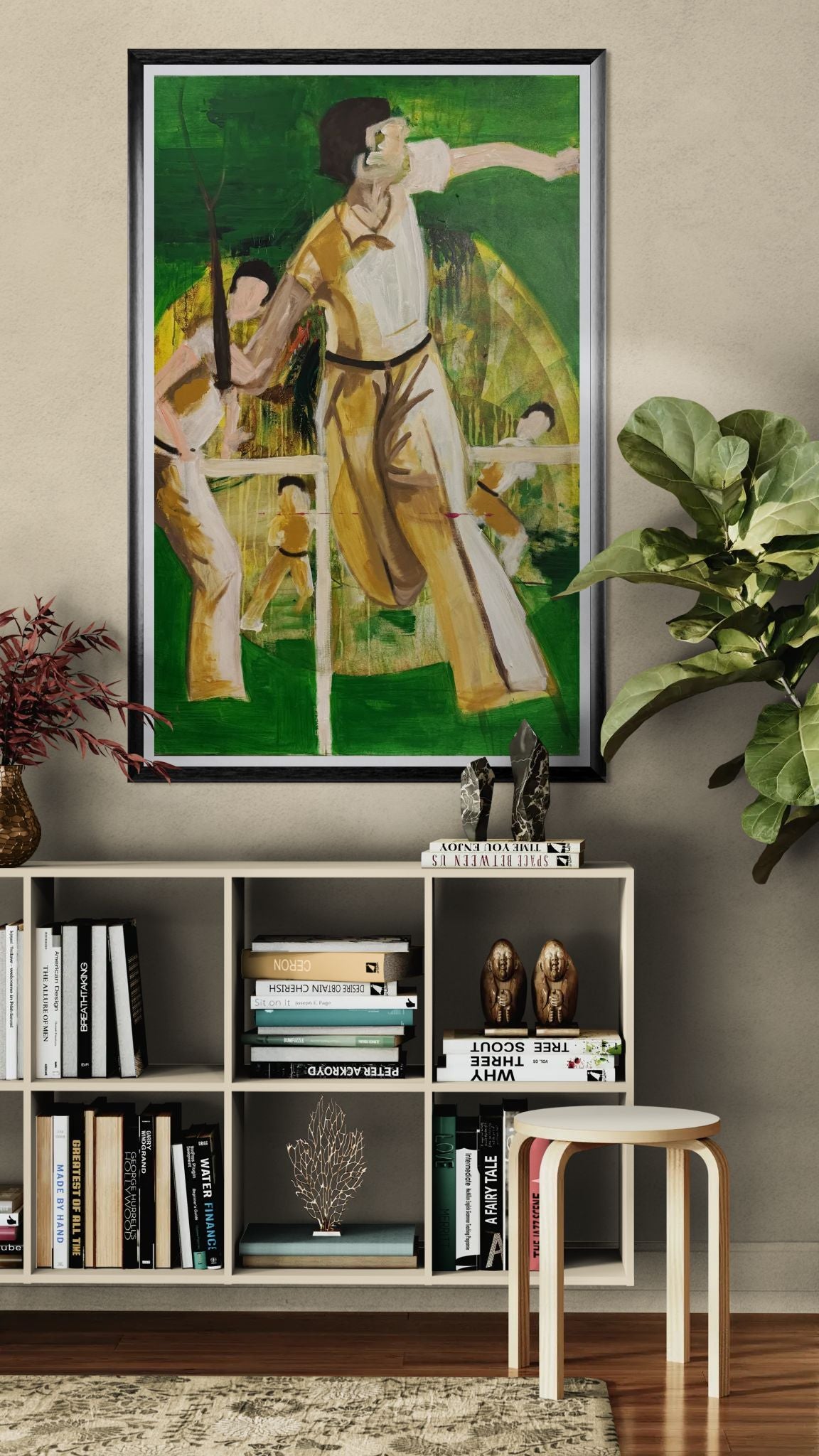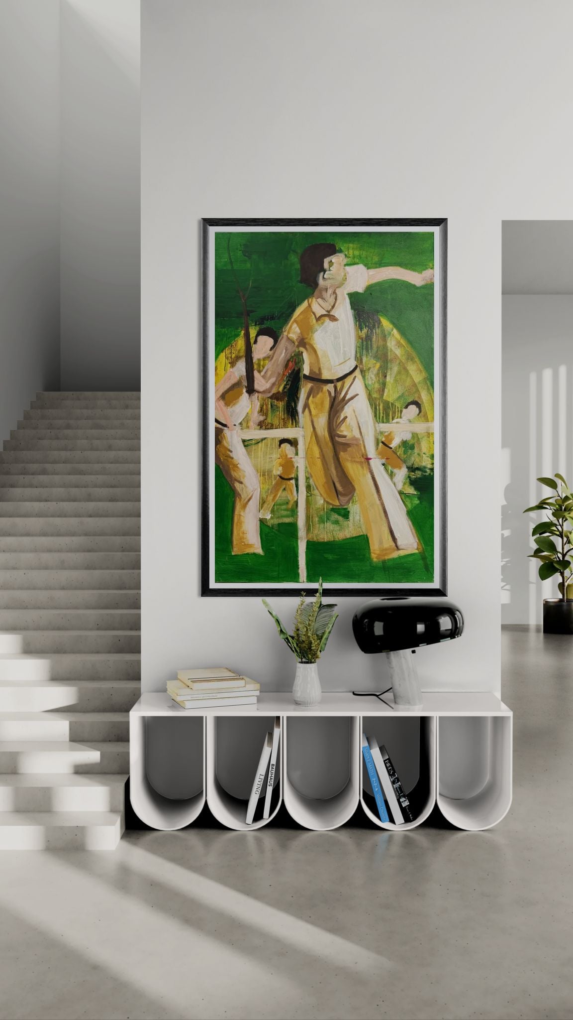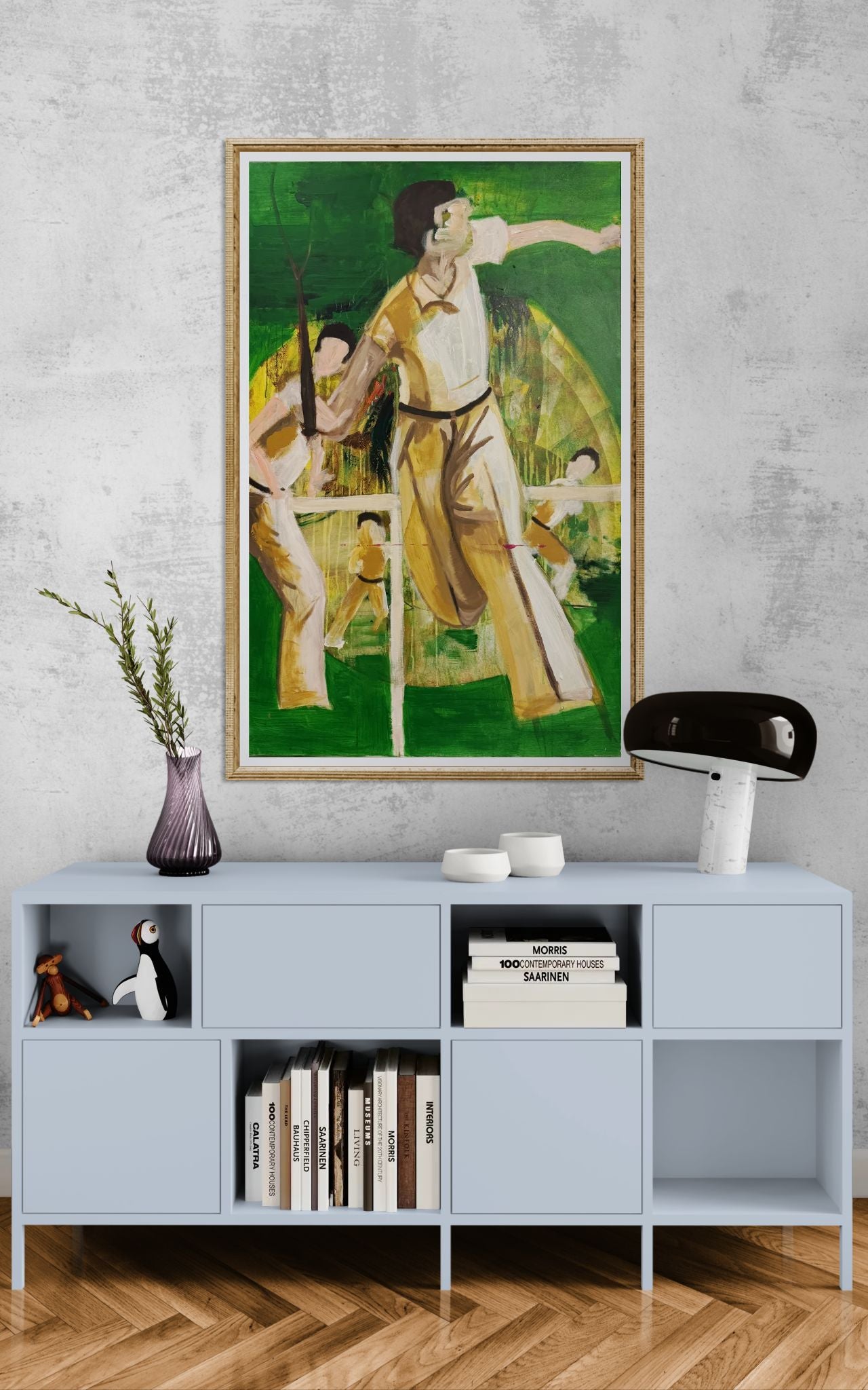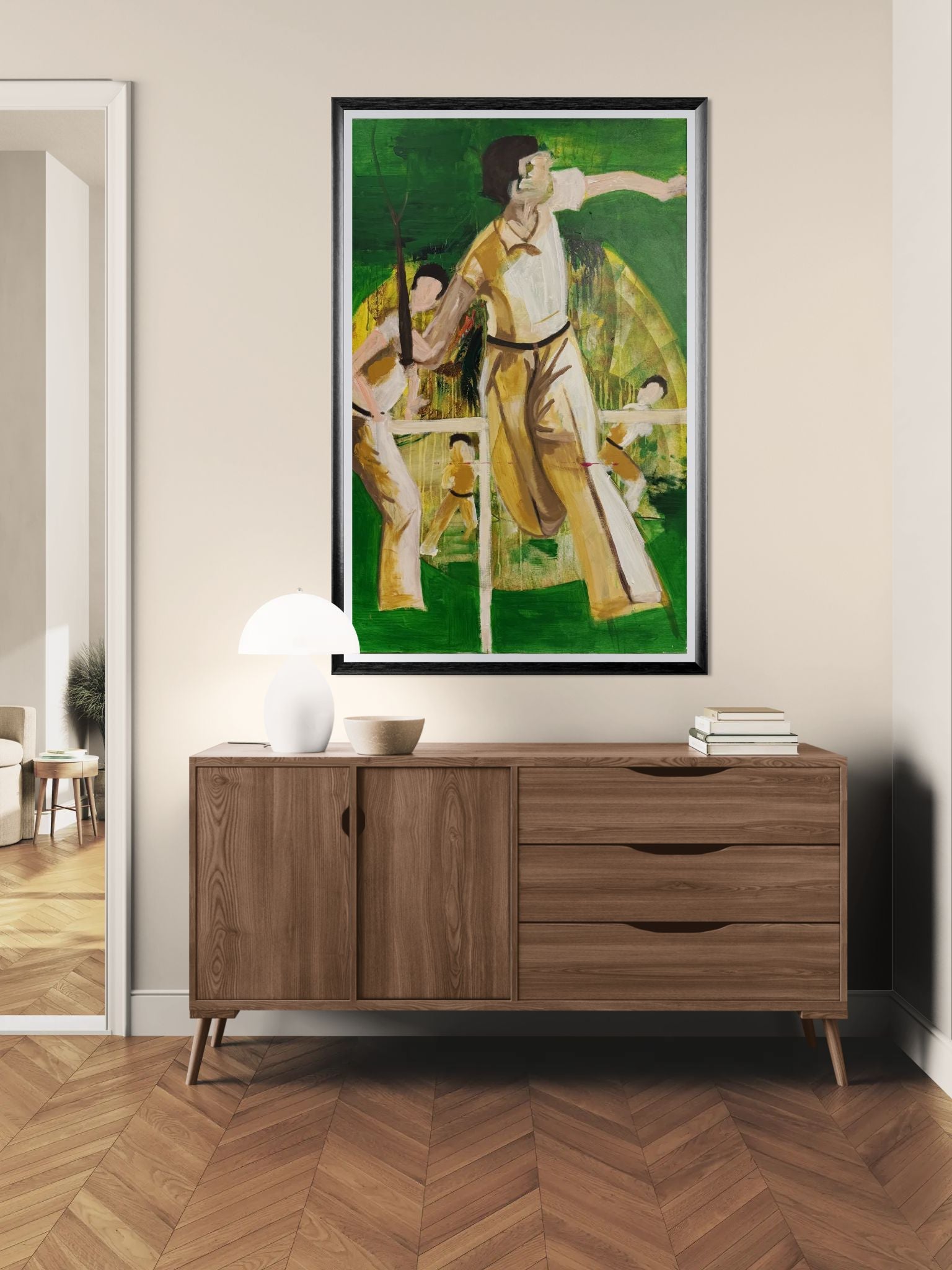 Match Point is a 120 × 80 cm acrylic on canvas, a powerful composition capturing both movement and stillness. With bold green tones framing the figure, this piece channels the intensity and focus of the decisive moment — when everything hinges on a single strike.
