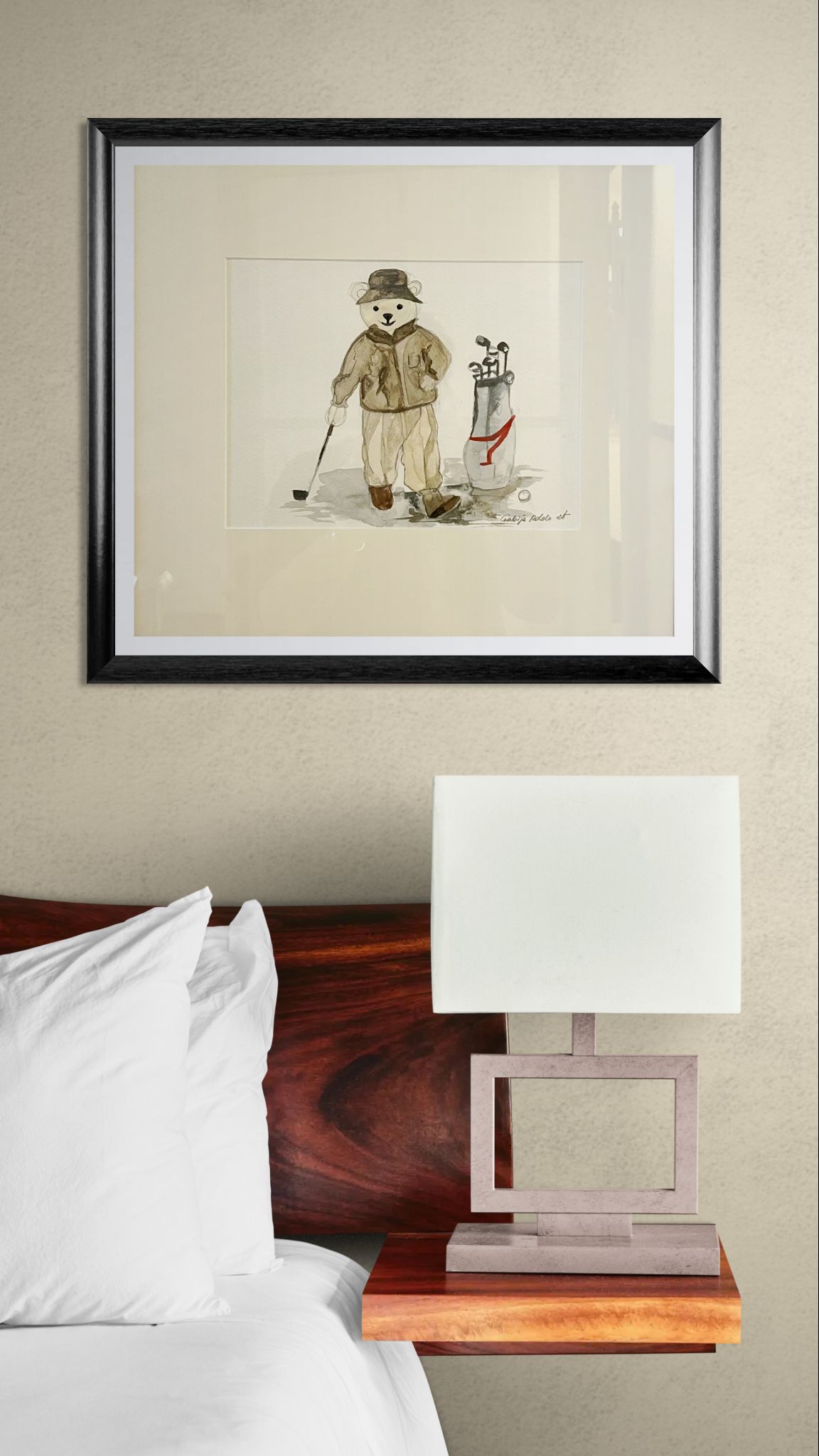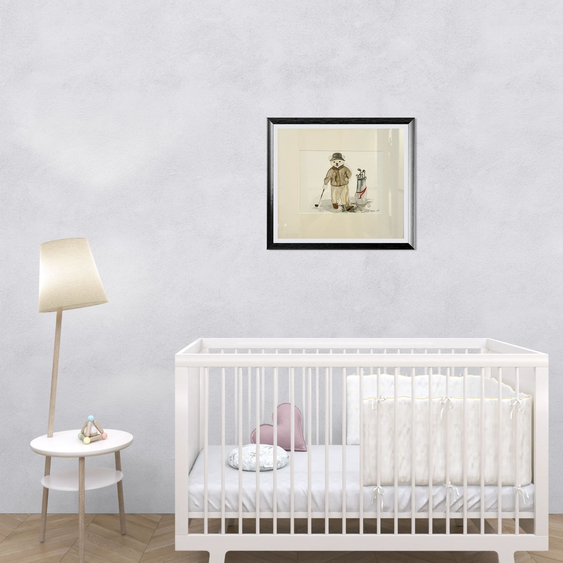 “Mr. Bear” is a charming and nostalgic watercolour that evokes the warmth of childhood. With delicate detail and soft tones, the piece captures the innocence and comfort that a beloved teddy bear represents.