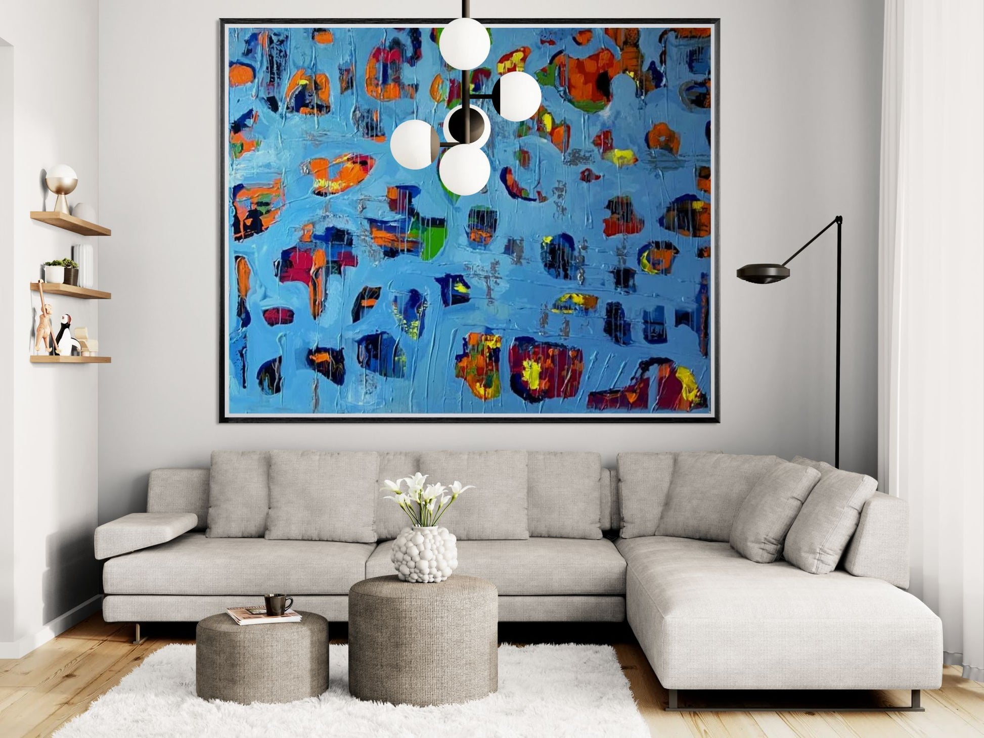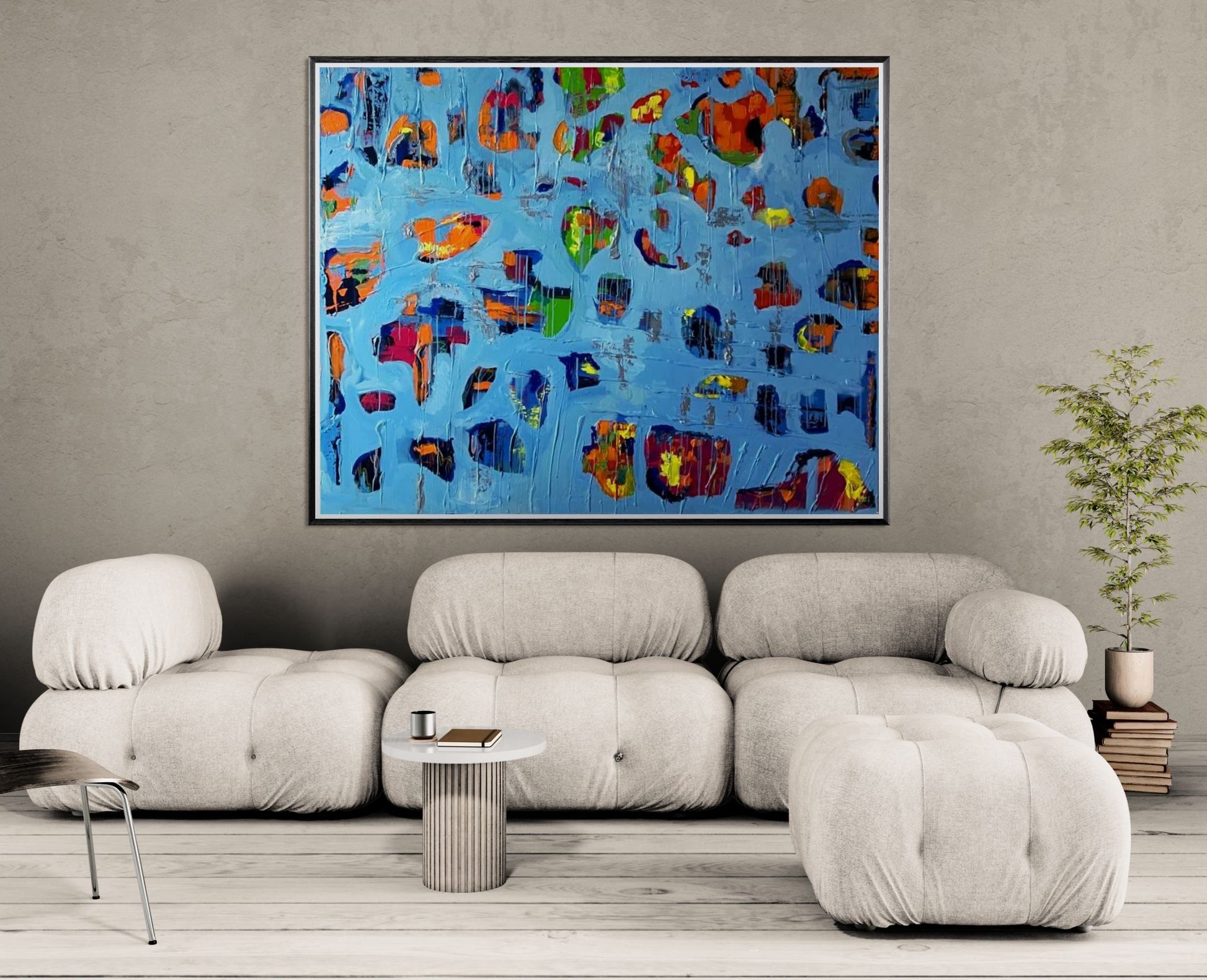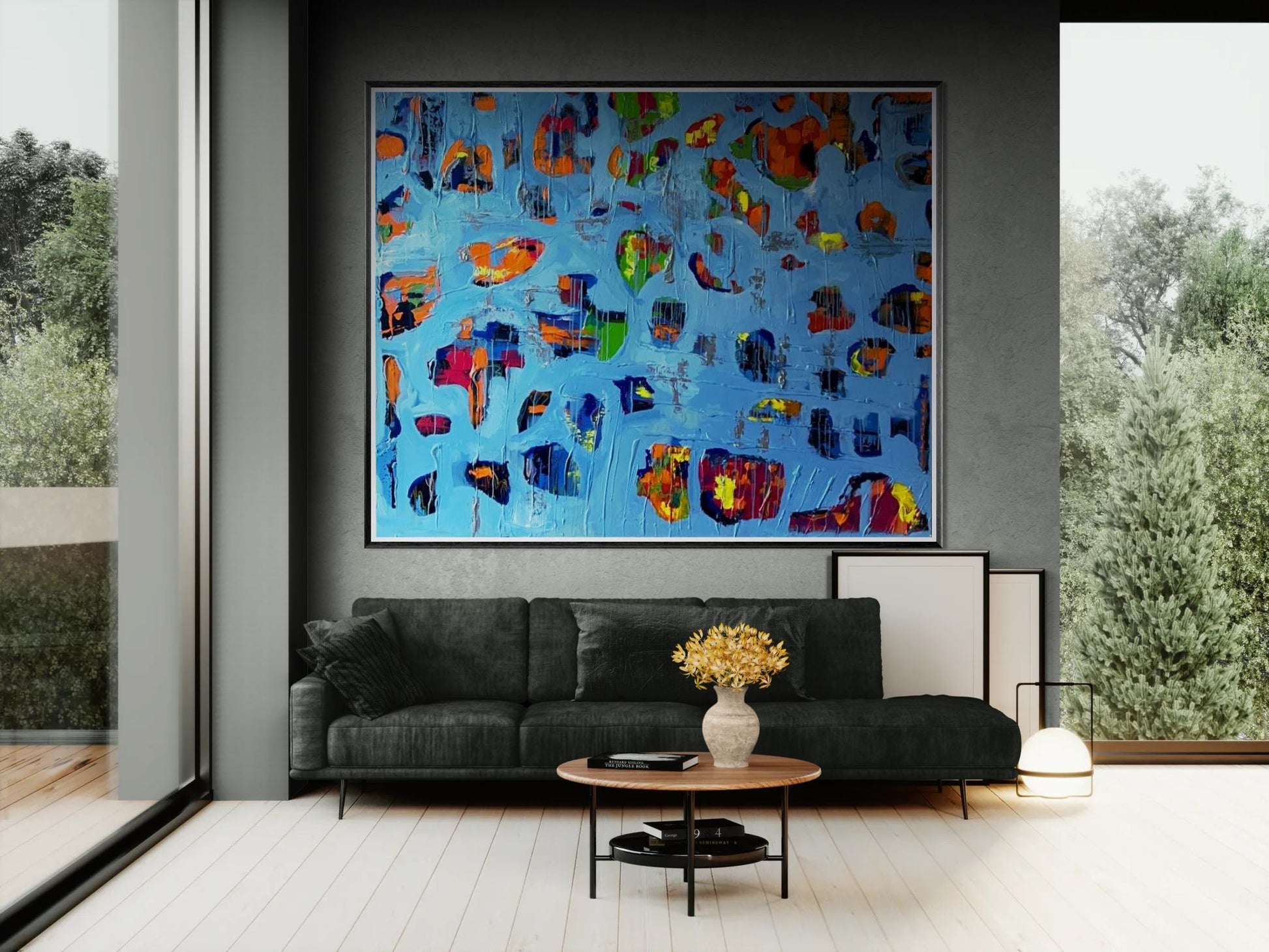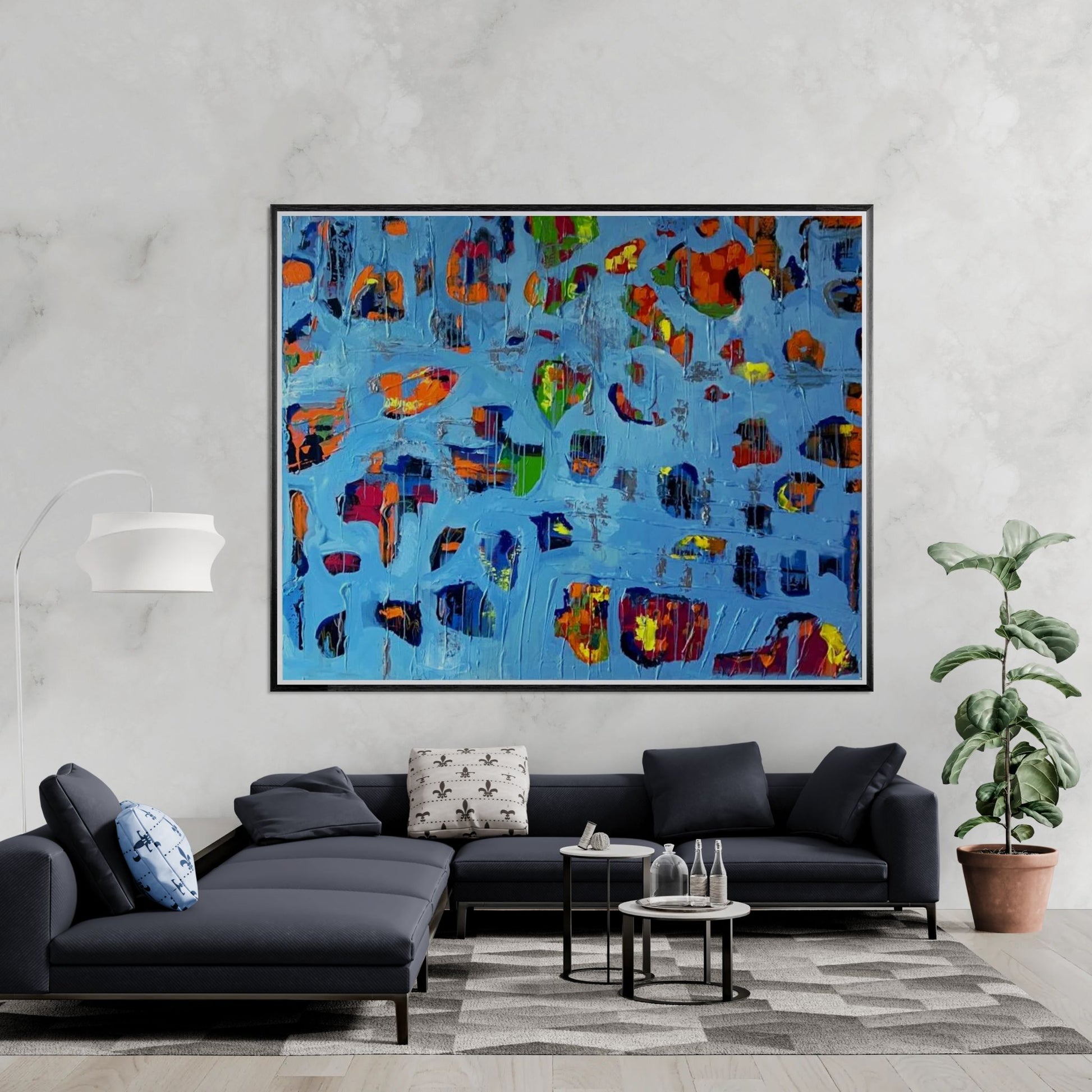 “Rief” is a monumental work by Gabija Adele — a large-scale acrylic on canvas, radiating color, movement, and layered symbolism. The deep ocean-blue background is alive with abstract forms, marine motifs, and fragments of imagination, creating a dynamic reef-like world that shifts with every glance.