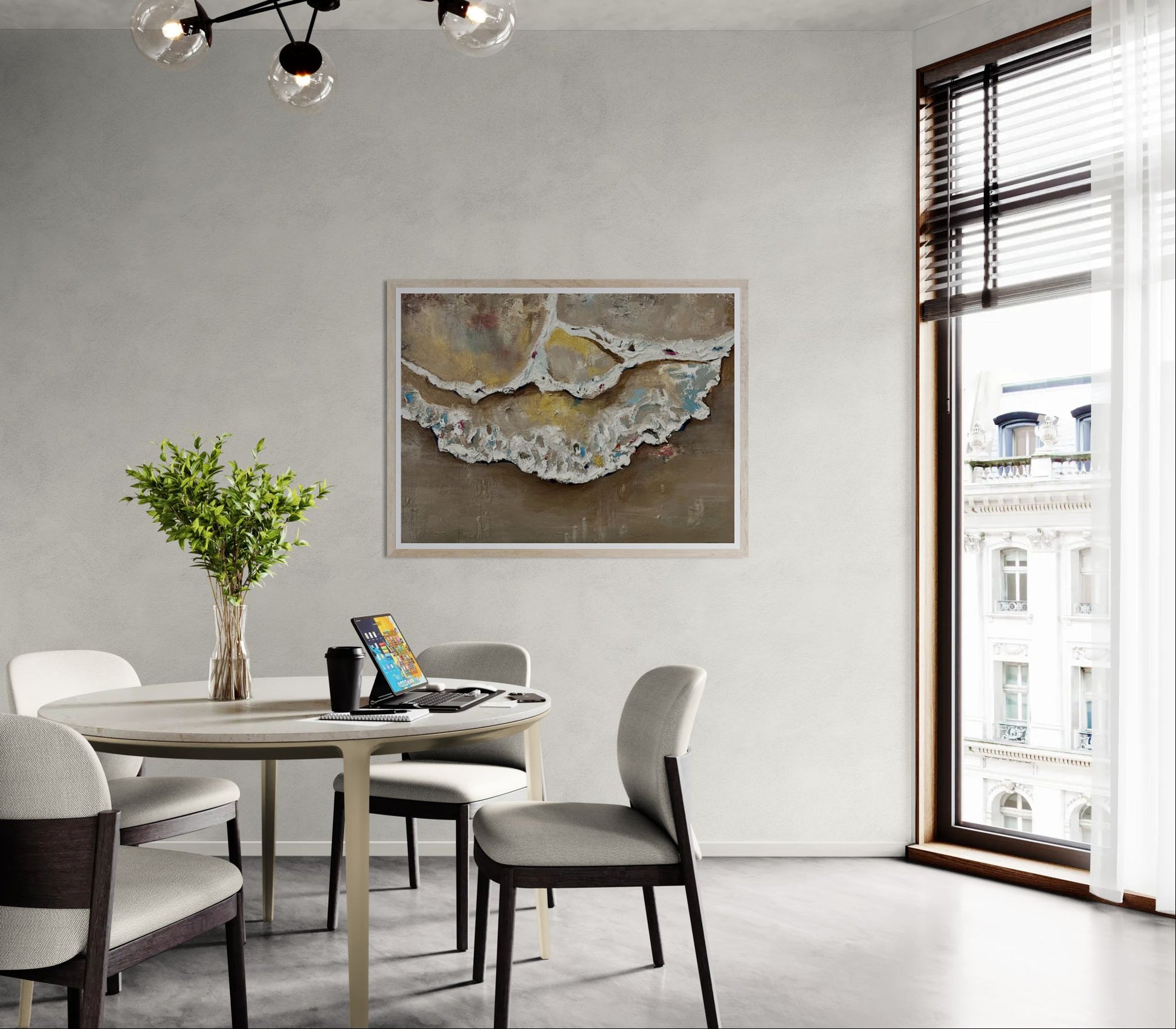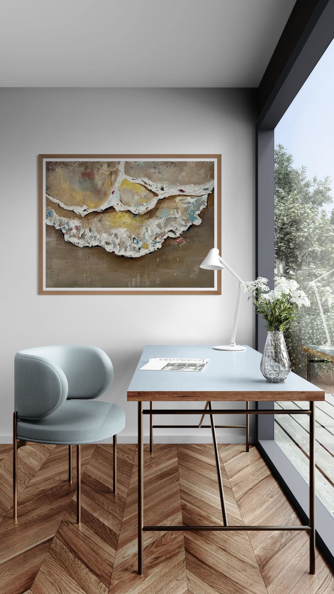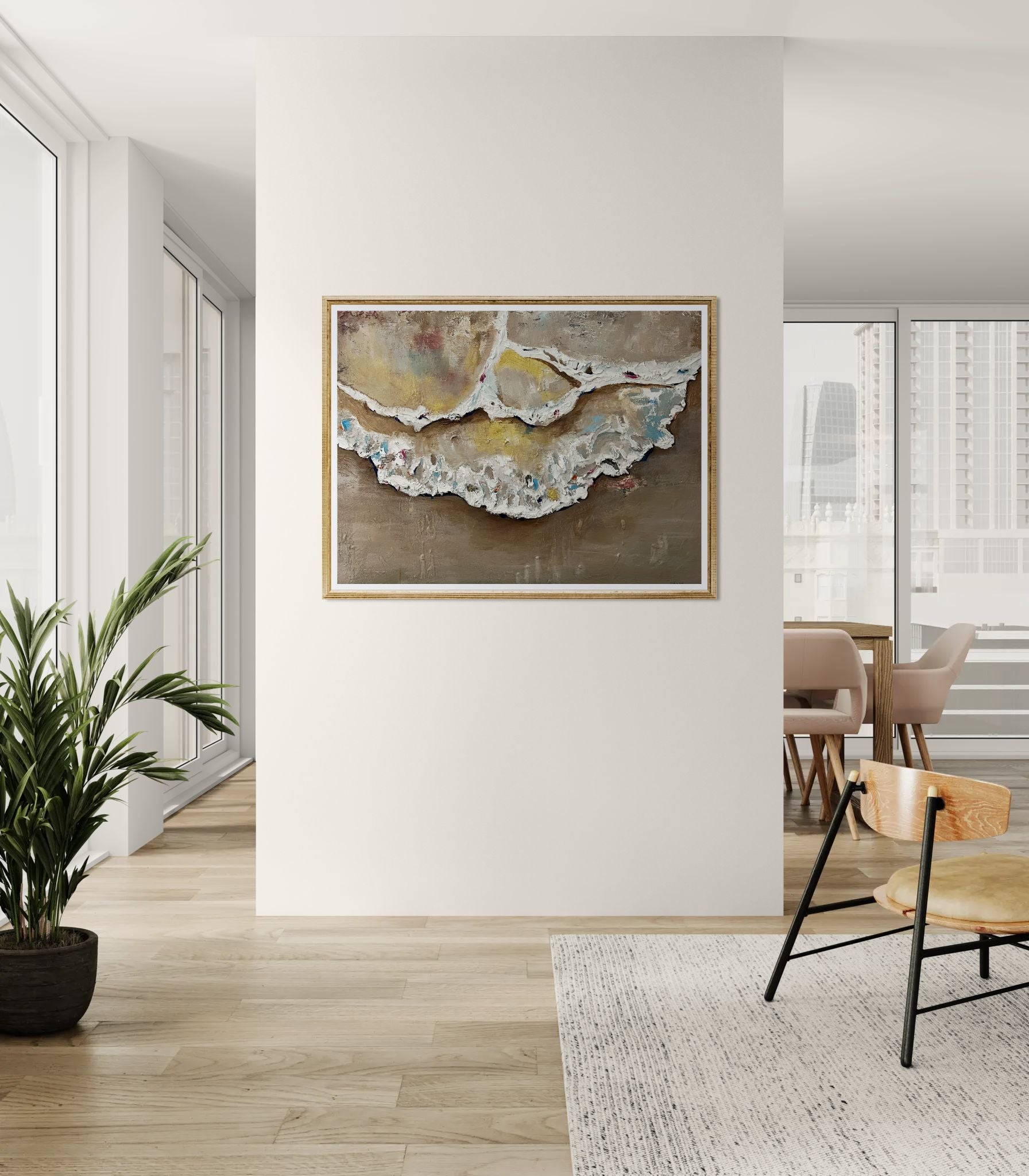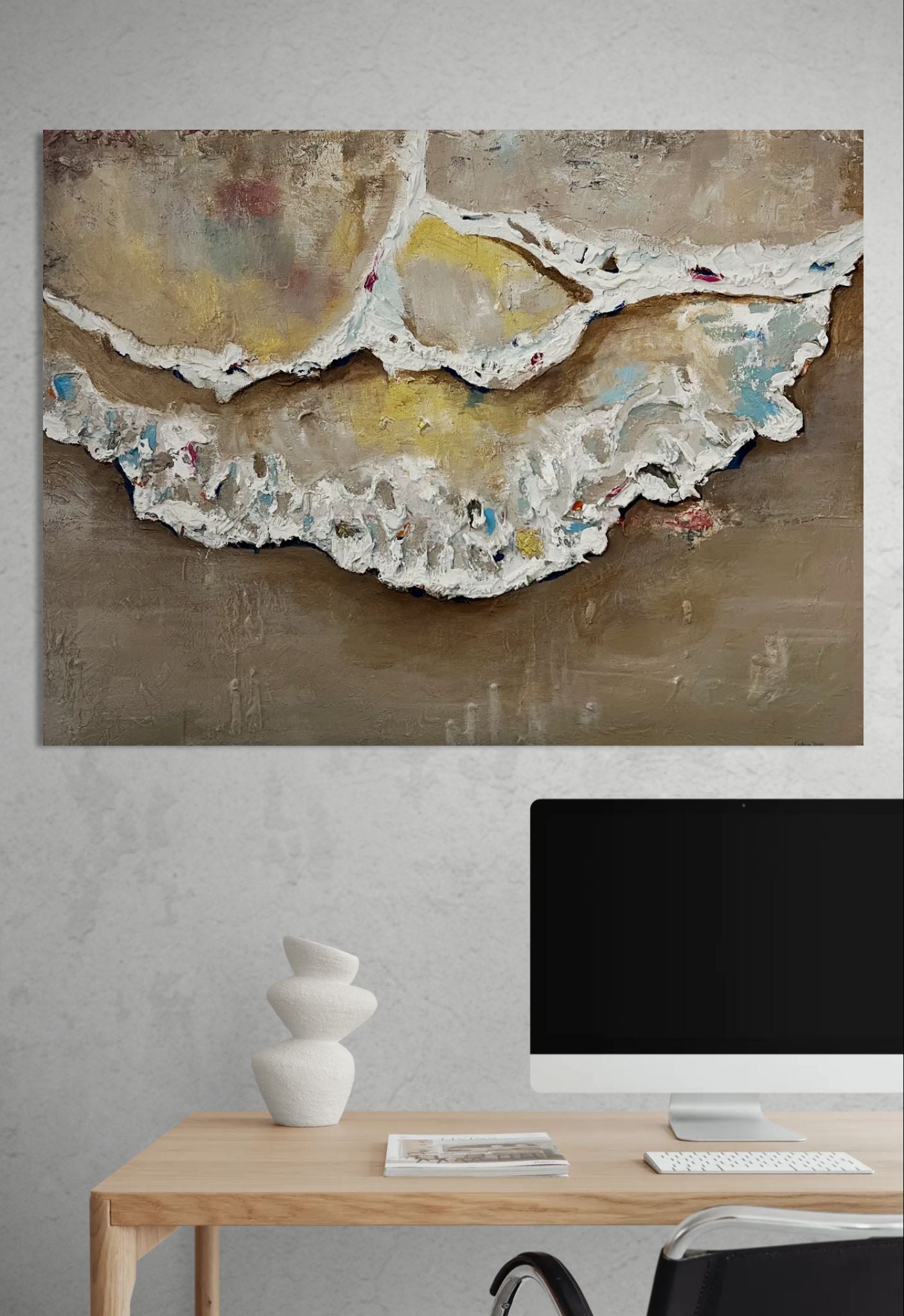 Inspired by the Lithuanian seaside village of Pervalka, this acrylic on canvas captures the layered textures and shifting tones of sand, stone, and sea. Measuring 120 × 90 cm, the work combines acrylic paint with textured materials, creating a surface that feels alive — rippling like dunes under sunlight.