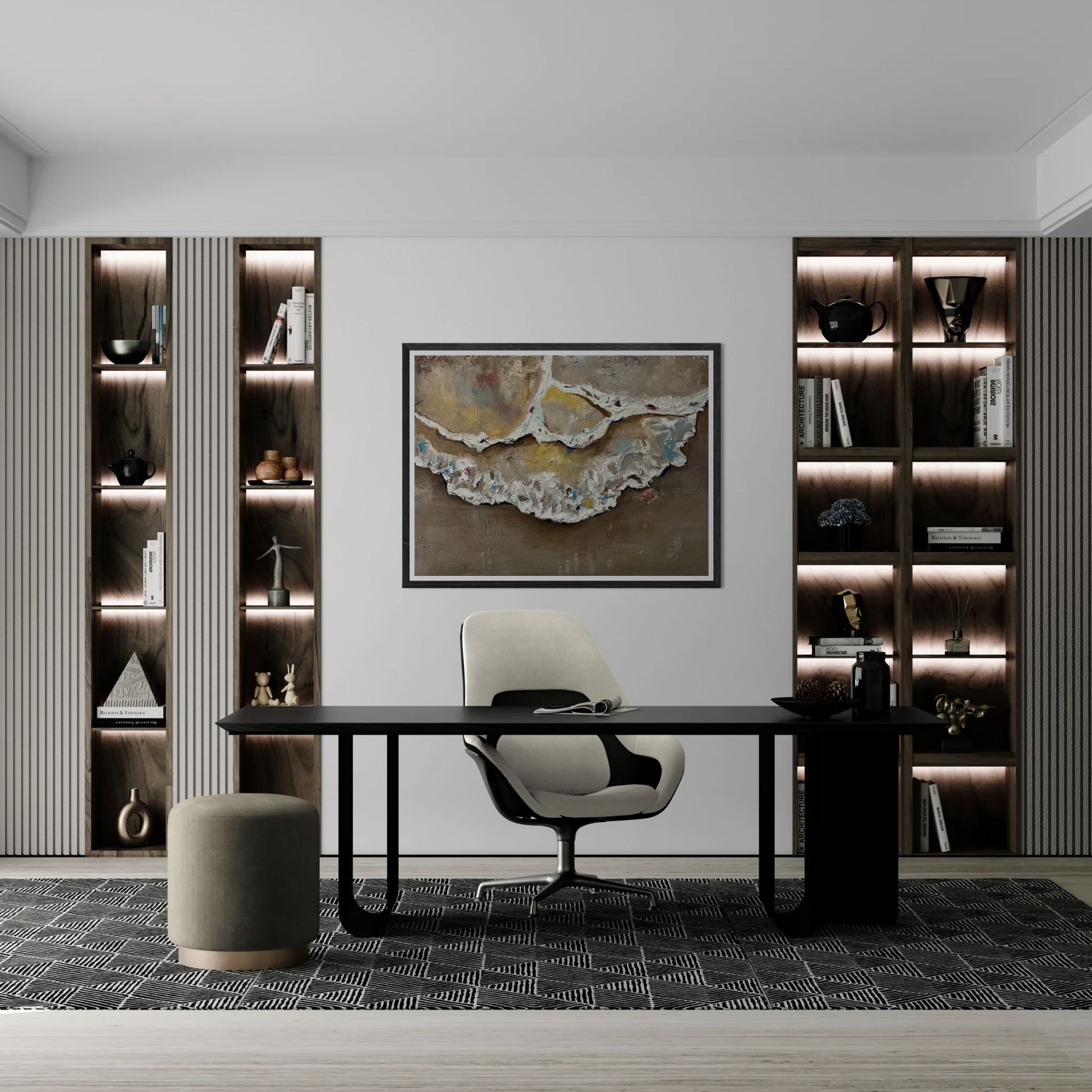 The muted earthy palette reflects both permanence and impermanence: the timeless presence of coastal landscapes and the fleeting marks of wind and tide. Gabija Adele’s “Pervalka” transforms natural memory into contemporary abstract art.