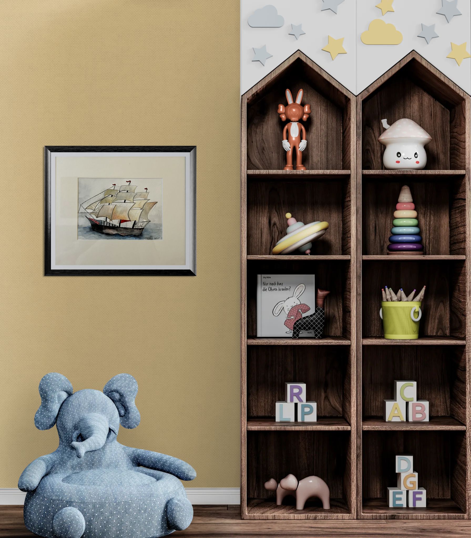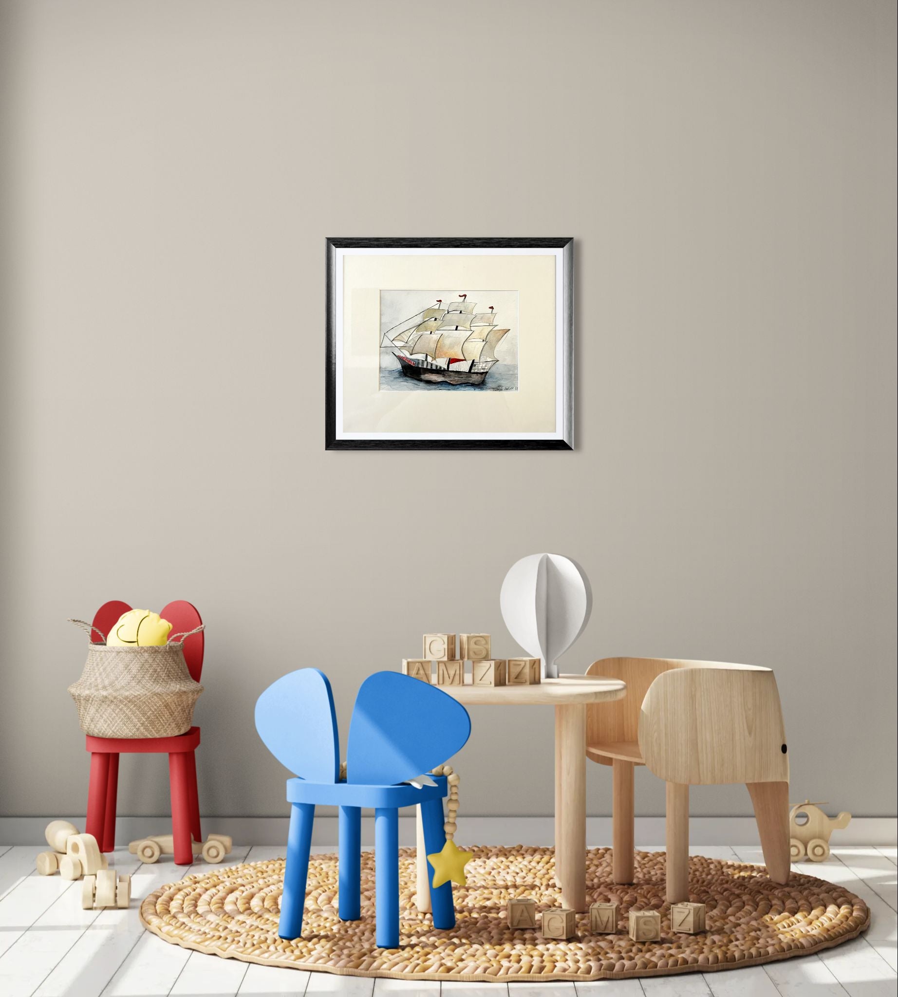 “Pirates Ship” is a playful and adventurous watercolour that captures the imagination of childhood and the timeless spirit of the sea. Its delicate tones and soft brushwork bring movement to the sails and waves, making it both whimsical and refined.
