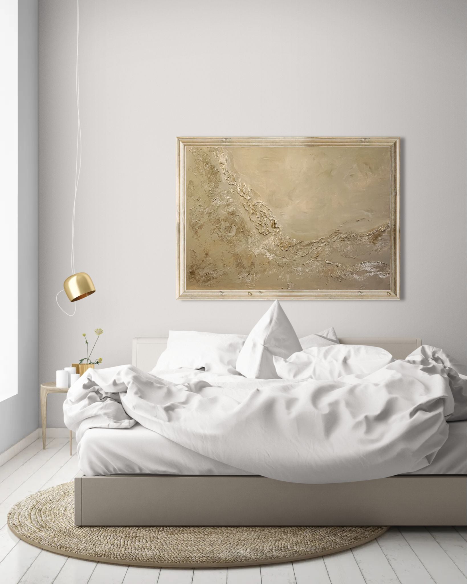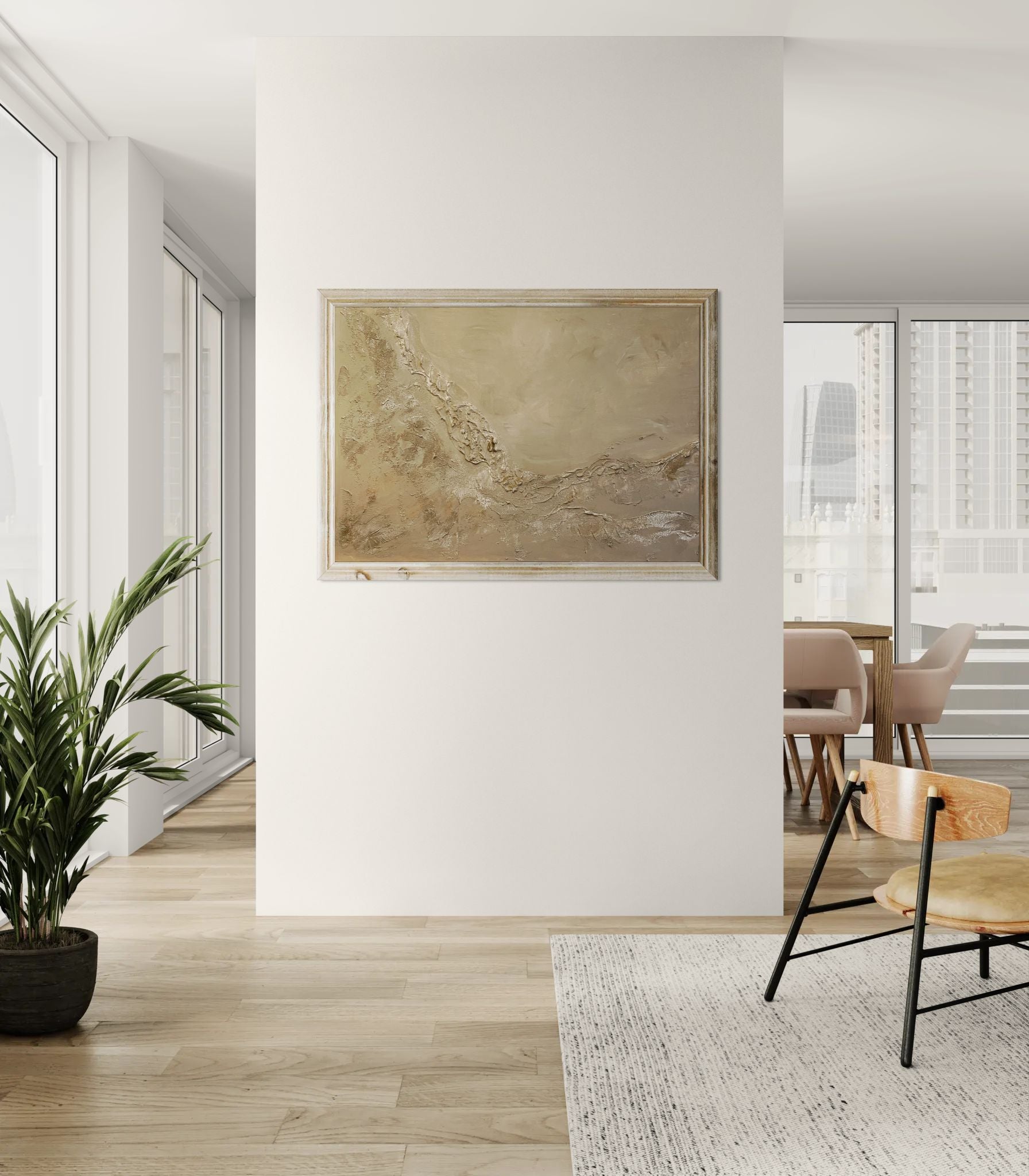Inspired by natural landscapes, this piece captures both the vast stillness of dunes and the raw movement of nature. The muted tones and sculptural relief make it a commanding work — one that resonates with both contemporary minimalism and organic form.